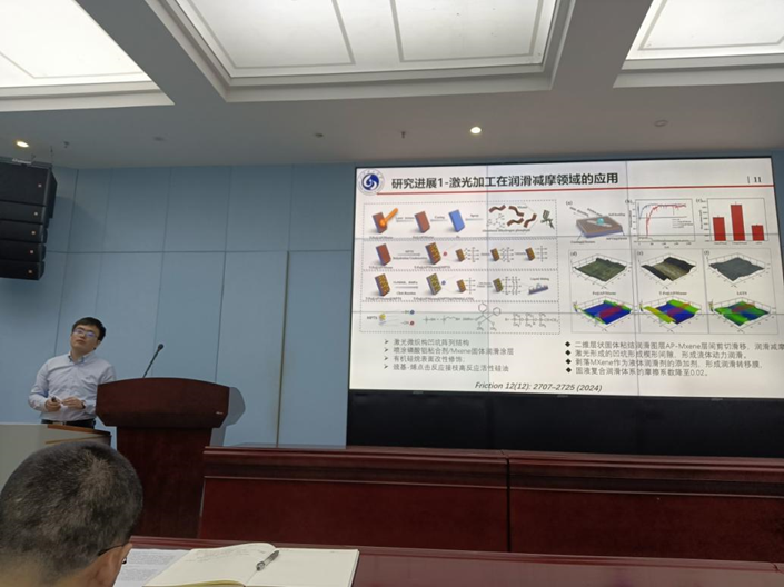 刘明明教授在报告中指出,超快激光技术正以皮秒/飞秒级精度突破传统表面加工的物理限制,其核心优势在于“非接触加工与高可控性”。通过仿生设计与激光微纳结构结合,刘教授团队开发出多功能工程表面。他以润滑技术为例解释,“仿生鱼鳞梯度结构协同液体润滑剂,摩擦系数可低至0.02,并有效提升油膜的承载力。”随后,他从润滑减摩、能源传感、液体操控、污水处理及材料防护等五个方面,详细介绍了超快激光技术在不同行业中的应用前景及研究成果。本次报告以先进技术与生动案例的展示,为crown皇冠体育平台师生呈现了超快激光技术的跨学科应用潜力,进一步激发了师生在材料表面工程和仿生摩擦学等领域的创新活力。