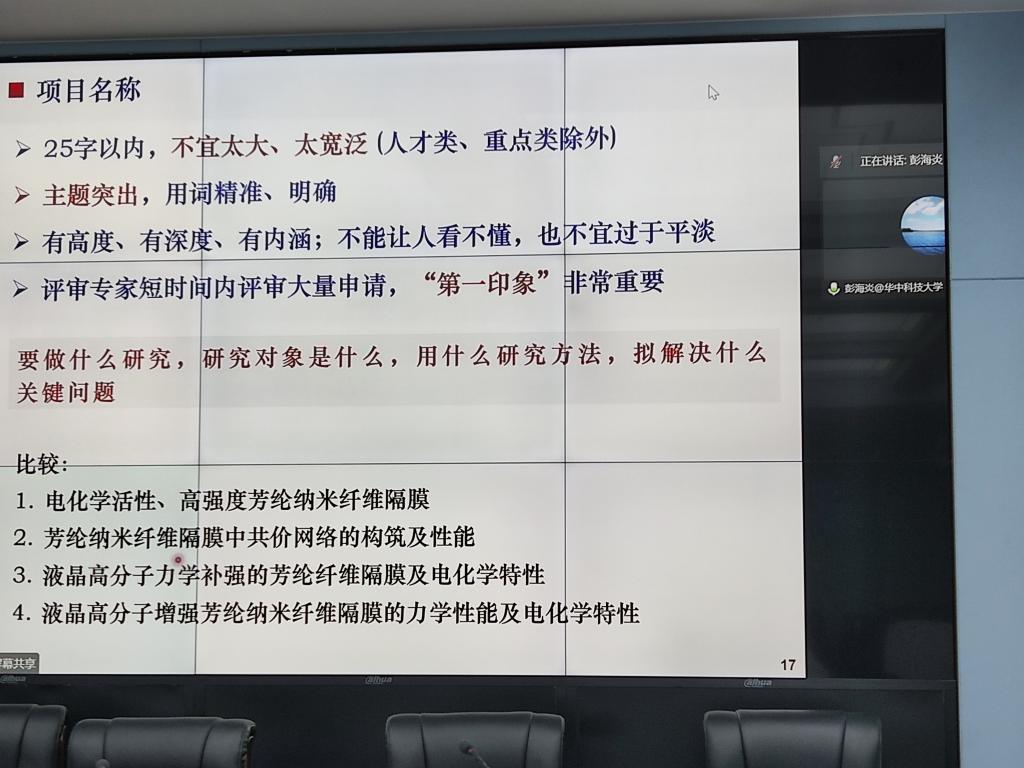受crown皇冠体育平台邀请,华中科技大学彭海炎教授于11月29号为crown皇冠体育平台青年员工做了一场国家基金辅导报告。由于疫情防控的缘故,报告会选择在腾讯会议上开展,同时在crown皇冠体育平台二楼学术报告厅设立大屏同步直播,以方便有需要的老师。本次报告由crown皇冠体育平台副院长施德安教授主持,相关员工参加了报告会。