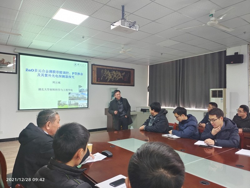 2021年12月28日,应湖北师范大学先进材料研究院的邀请,何云斌教授到访该学校。交流访问期间,何云斌教授作了题为“ZnO多元合金薄膜带隙调控、P型掺杂及其紫外光电探测器探究”的学术报告。该院先进材料研究院、物电crown皇冠体育平台部分员工、研究生聆听了报告。报告会上何云斌教授细致全面地介绍了他们课题组多年来在ZnO材料方面的研究成果,通过制备ZnO的多元合金薄膜实现了对ZnO带隙的调控、并且实现了稳定的P型掺杂,这些成果为ZnO材料在新型紫外光电探测方面的应用奠定了基础。报告结束后,何云斌教授与在场师生就相关问题进行了深入的讨论。