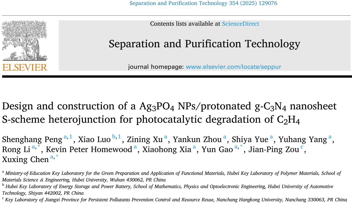 近日,crown皇冠体育平台2021级本科生彭圣航在学业导师李荣和陈绪兴老师的指导与帮助下,在工程技术Top期刊《Separation and Purification Technology》上发表名为“Design and construction of a Ag3PO4NPs/protonated g-C3N4nanosheet S-scheme heterojunction for photocatalytic degradation of C2H4”的研究型论文,彭圣航为论文第一作者,李荣、陈绪兴、高云老师为论文共同通讯作者。