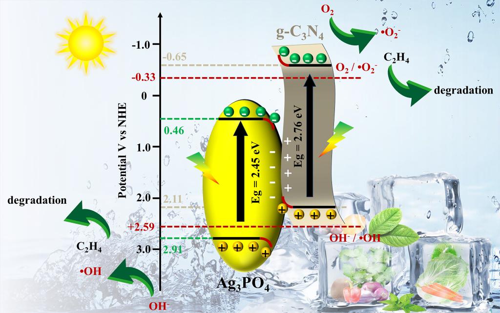 乙烯(C2H4)作为植物生长中的一种代谢产物,在新鲜农产品储存和冷藏过程中会加速其成熟和变质,从而造成巨大的经济损失。开发一种常温常压下高效去除乙烯的绿色环保技术以用于果蔬保鲜具有重要的实际应用价值。本课题组过去几年一直探索光催化技术在果蔬保鲜中的应用(Chem. Eng. J., 2017, 320, 644;Chem. Eng. J.,2022, 429, 132241;J. Hazard. Mater., 2022, 424, 127685;Energy Environ. Mater.,2024, 7, e12643;Sep. Purif. Technol., 2023, 327, 124948;Sep. Purif. Technol., 2022, 297, 121478;ACS Appl. Nano Mater., 2021, 5, 1828.),然而在可见光照射下实现C2H4的高效催化降解仍然是一个重要的挑战。S型异质结具有高效分离光生载流子和保留强大的氧化还原活性位点的优势。本研究工作中,首先通过密度泛函理论(DFT)计算精确地预测了Ag3PO4和g-C3N4的相对能级排列和界面电荷转移动力学,从而确定了Ag3PO4和g-C3N4之间形成S-型异质结的可行性。为了增强内建电场的强度,构建良好的界面,在成功合成超薄g-C3N4纳米片后进一步质子化改变其Zeta电位。这种修饰可以在二维g-C3N4表面上增加活性位点,以获得丰富的官能团和良好的分散性。在模拟太阳光和可见光照射下研究了S-型Ag3PO4NPs/质子化g-C3N4纳米片复合材料。利用UV-Vis DRS、UPS、原位辐照XPS和EPR分析了Ag3PO4和g-C3N4的空间电荷转移途径,证实了S-型异质结的成功形成。结果表明,该独特的结构设计不仅能够有效地改善Ag3PO4自身所存在的严重光腐蚀,提高催化剂的稳定性,而且能实现高效的电荷转移和足够的氧化还原能力。该研究推进了旨在从空气中去除C2H4和提高Ag3PO4等光腐蚀物质稳定性的技术探索。