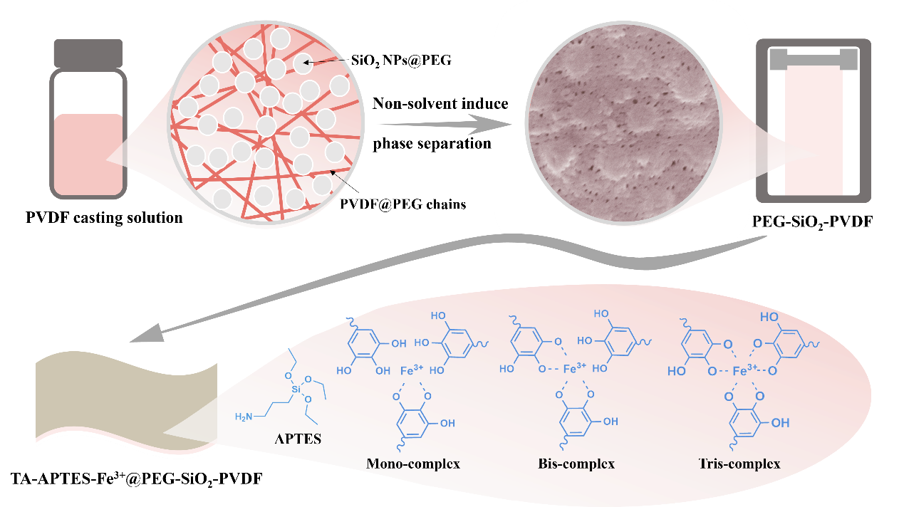 工业和生活中排出的含油废水严重危害了环境以及动植物的生命健康。膜分离技术相比其他传统的分离技术具有操作简单、分离高效的优点,被经常用来进行油水分离中的难点——乳液分离。PVDF膜作为最常见的膜分离材料之一,具有机械强度高、化学稳定性好、抗氧化性强以及良好的成膜性能。但是由于PVDF膜中-F基团的存在使得膜表面能较低,容易被油污和蛋白黏附导致分离效率低下,限制了PVDF膜的实际应用。将PVDF膜亲水化处理是提高其耐污性的方法之一。在这项工作中,团队提出了通过协同共混和表面涂层修饰的技术,成功将疏水性PVDF膜改性成为超亲水/水下超疏油膜。共混添加亲水性纳米颗粒不仅调整了膜表面的孔径大小,而且提高了膜的亲水性能。协同孔径筛分和表面润湿性诱导油滴在膜表面变形聚集破乳,改性PVDF膜能成功地对小尺寸高稳定性的含表面活性剂的甲苯乳液进行分离,分离通量和效率分别为678 L h−1m−2bar−1和99.57%。并且成功对正己烷、二氯甲烷、异辛烷、和环己烷等重/轻油水包油乳液进行分离。以上工作得到了国家自然科学基金重点项目和湖北省创新团队项目的支持。