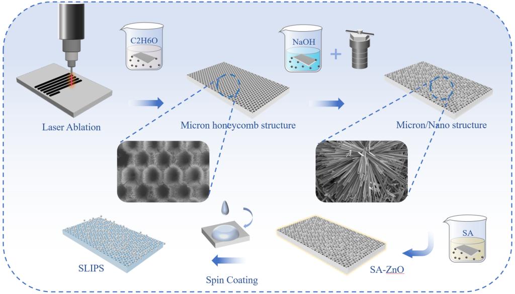 全球淡水资源面临严峻的水安全挑战,缺水会扰乱河流流量、生态系统功能和粮食安全,从而破坏经济发展。此外,极端天气频发,结冰和结霜给人类的日常生活带来不便,道路上的积雪和结冰导致交通受阻,电力系统因冻雨天气瘫痪。简单高效地获取清洁淡水资源和制备一种耐用的抗结冰表面具有重要意义。基于绿色低碳的发展理念,受蜂巢结构启发该研究团队成功的制备了一种多维润滑剂注入表面,它具有良好的润滑剂锁定能力,同时还具有出色的机械耐久性,成功地实现了长期有效的雾水收集和抗结冰。针对单一的二维注油表面,该团队制备了一种受蜂窝结构启发的耐用注油表面,制备过程如图1所示。在基底上通过激光刻蚀的方法制备出了具有优秀机械强度和高比表面积的微米级蜂窝状结构,然后在蜂窝状结构中制备了纳米级松针状ZnO,在经过硬脂酸改性后得到了超疏水的微纳米复合结构,最后注入二甲硅油得到了高耐用性的注油表面并且具有优异的抗结冰和雾水收集性能。