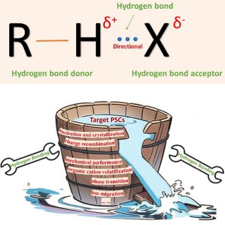 文章指出,单结钙钛矿太阳能电池的效率已达到26.1%,更多的注意力已转向提高其内在稳定性和环境稳定性。钙钛矿材料的光电特性和器件内的相互作用不仅取决于其组成原子,还取决于相邻原子,因此有必要进一步了解和探索功能材料与器件之间的相互作用。文章论述了钙钛矿太阳能电池中的氢键作用,包括每个功能层以及界面(图2)。尽管氢键作用力相对较弱,但它可以极大地影响材料性能。文章还讨论了氢键对结晶、稳定性、离子迁移、相变等行为的影响,以及精确调控氢键以获得目标性能的策略。钙钛矿太阳能电池中氢键的研究仍然相对匮乏并且存在争议,通过更深入的了解与研究,人们可以进一步利用氢键作为一种多功能工具来解决钙钛矿太阳能电池商业化过程中的技术挑战。