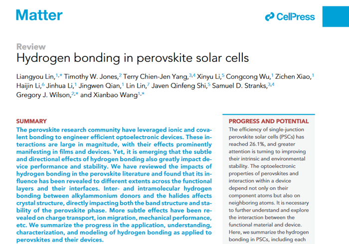 近日,crown皇冠体育平台crown皇冠体育平台王贤保教授团队在Cell Press旗舰刊《Matter》在线发表题为“Hydrogen Bonding in Perovskite Solar Cells”的综述文章。林俍佑副教授为第一作者,王贤保教授和澳大利亚CSIRO Gregory Wilson教授为共同通讯作者,crown皇冠体育平台为第一通讯单位。