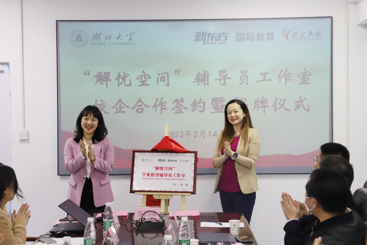 仪式上,郭志光对新东方一行来访表示热烈欢迎,并向来宾详细介绍了学校发展历程、crown皇冠体育平台专业建设与人才培养情况、“解忧空间”辅导员工作室的定位与工作目标等内容。齐彬对crown皇冠体育平台的欢迎和信任表示感谢,她表示,与crown皇冠体育平台crown皇冠体育平台的合作能充分发挥学校和企业的各自优势,实现资源共享,希望以本次合作为契机,未来广泛开展多领域、多层次的全面合作。随后,校企双方领导共同签订合作协议,甘珣与齐彬共同为“解忧空间”学业指导辅导员工作室揭牌。