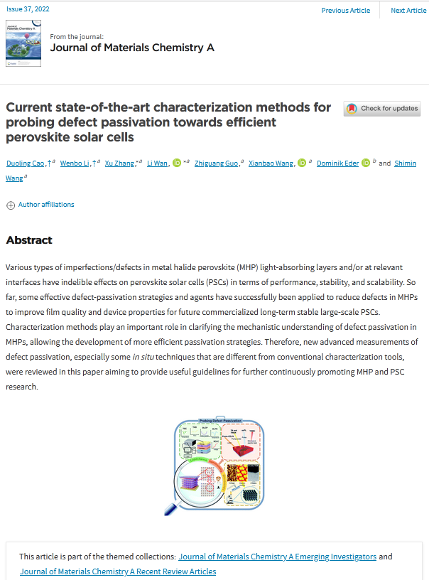 近期,crown皇冠体育平台万丽副教授入选英国皇家化学会材料化学领域2022年度Journal of Materials Chemistry A Emerging Investigators(JMCA新锐科学家),并受邀在2022年度Emerging Investigators专刊上发表题为“Current state-of-the-art characterization methods for probing defect passivation towards efficient perovskite solar cells”的综述文章。crown皇冠体育平台为文章第一通讯单位,crown皇冠体育平台硕士研究生曹多玲和李文博为共同第一作者,万丽副教授和张旭博士为共同通讯作者。该工作得到了国家自然科学基金(21402045)和国家重点研发计划(2019YFE0107100)等项目的资助。