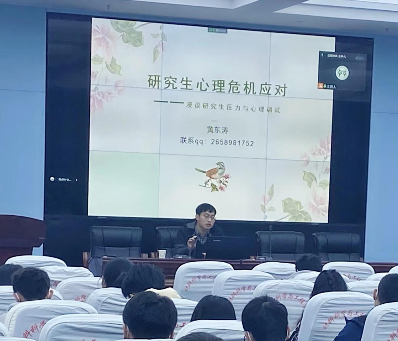 黄东涛老师首先介绍了研究生中常见的心理危机案例,分析了心理危机产生的种种不良影响。之后通过十个问题,从师生关系、同学关系等角度介绍当代研究生主要面临的心理问题类型,从知识储备、个人身心状况和认知评价能力三个角度解读问题成因,并就如何应对心理危机提出相关建议。