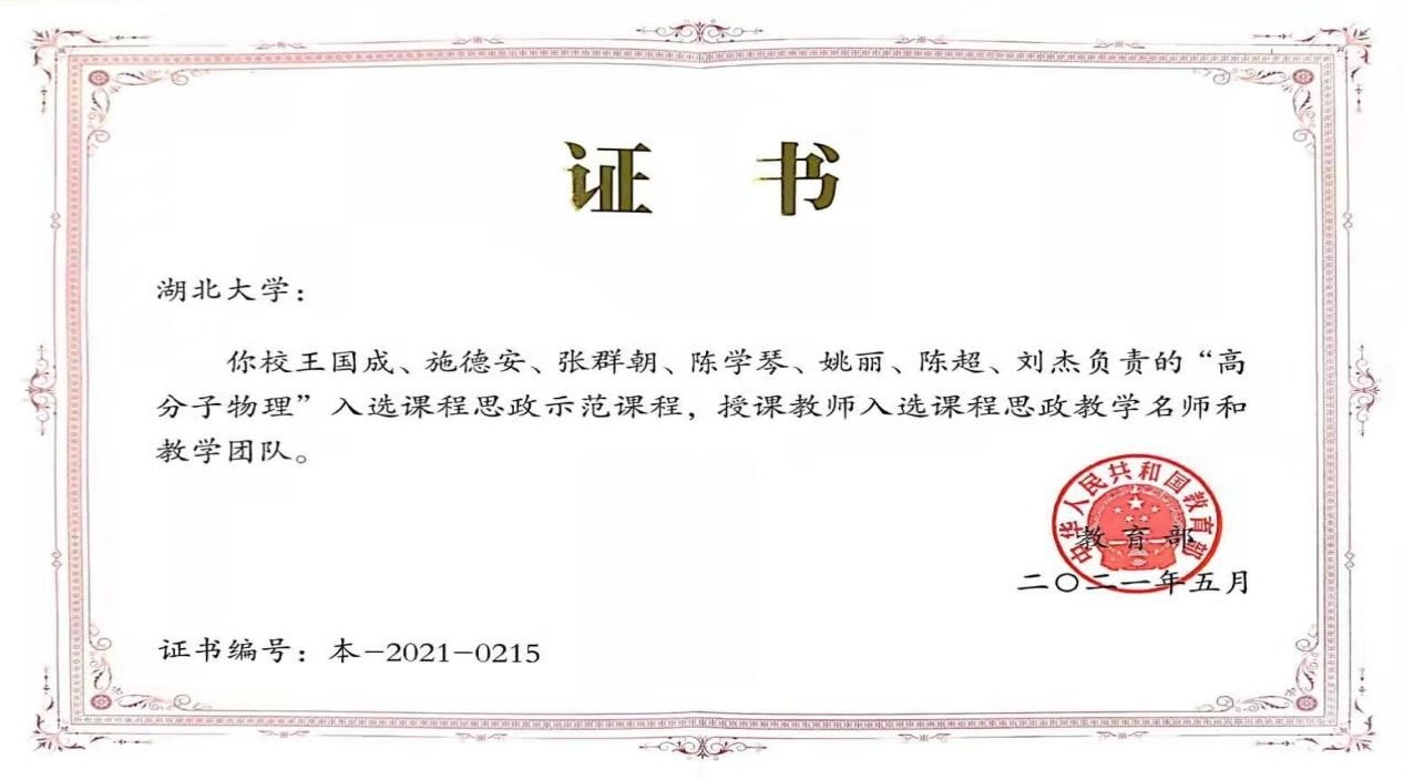 近日,教育部公布2021年课程思政示范项目名单,crown皇冠体育平台王国成、施德安、张朝群、陈雪琴、姚丽、陈超、刘杰等员工负责的高分子物理”教育课程获评教育部“课程思政示范课程”,七位授课老师均入选课程思政教学名师和教学团队。