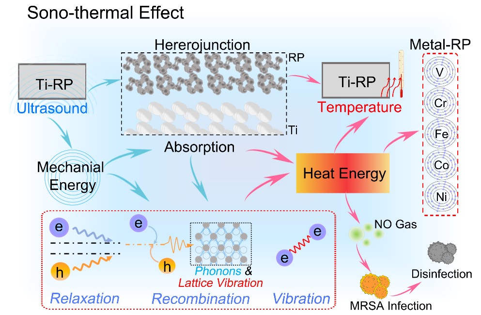 该团队利用界面工程策略在植入体表面构建了具有可控超声热效应能力的红磷-金属异质界面。这种异质结界面工程赋予了金属能够在具有高穿透性和生物安全性的超声波照射下原位显著发热的能力。同时通过对相关电子运动与超声波物理测试,表明这一策略的潜在机制不仅与超声激发电子和声子运动相关,并且可以普适性地在多种金属表面实现可控的超声热效应。此外,该团队将超声界面工程与气体疗法结合,在体外和体内实现了短时间高效的多重耐药消除治疗,仅仅治疗20分钟,对耐药菌的杀菌效率达到99.99%,而且可以重复使用。这项研究提供了一种新颖的金属-半导体异质结界面以实现材料-性能设计策略和理论,不仅克服了相关光热抗菌治疗难以深入的不足,同时为设计超声热效应材料提供了新的指导方向。这项研究在超声治疗耐药菌感染方面具有良好的临床应用前景。