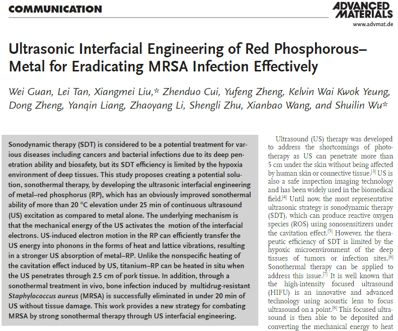 近日,刘想梅研究团队以crown皇冠体育平台为第一作者及通讯单位在国际材料科学的顶级期刊Advanced Materials(影响因子27.9)上发表了题为“Ultrasonic Interfacial Engineering of Red Phosphorous-Metal for Eradicating MRSA Infection Effectively”(红磷-金属超声界面工程用于高效清除多重耐药菌感染)的研究论文。硕士研究生关魏为论文的第一作者,课题组成员谭磊副教授为该论文的共同第一作者,刘想梅副教授为该论文的第一通讯作者。该研究同时得到了校内校外多个研究团队的协同支持。