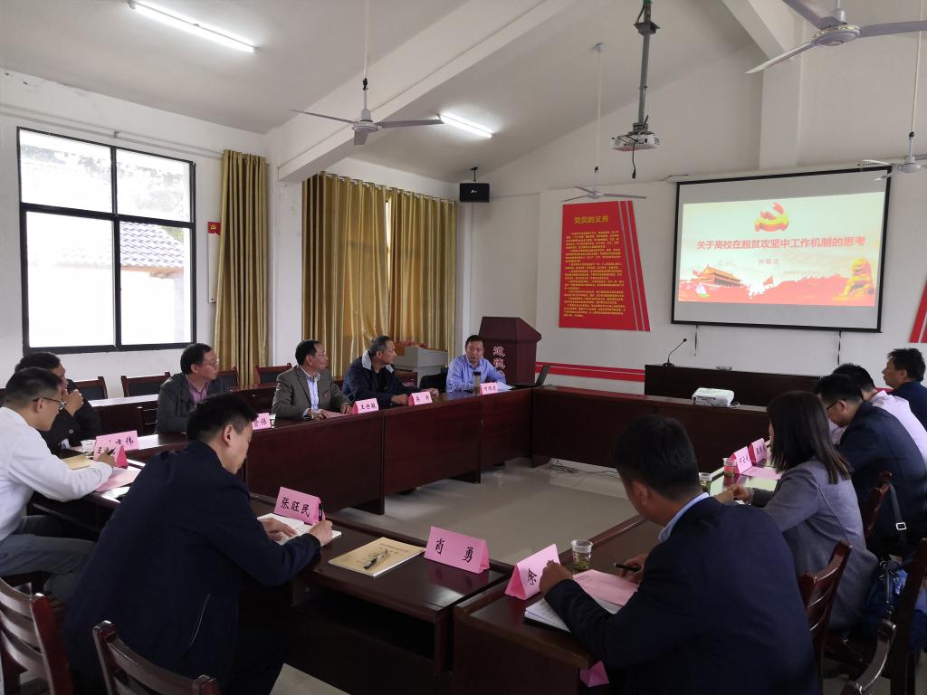 座谈会上,大屋冲村党支部书记介绍了村里基本情况,学校驻村工作队汇报了近期产业帮扶、教育帮扶等方面工作情况,科学技术发展研究院负责人结合科技项目转化、助力脱贫攻坚作专题发言,crown皇冠体育平台理论学习中心组全体成员围绕高校完善脱贫攻坚工作机制开展微党课学习,微党课由crown皇冠体育平台党委书记何顺进讲授,他以《关于高校在脱贫攻坚中工作机制的思考》为主题,围绕“党建共融,建强基层组织”、“智力共享,筑牢脱贫根基”、“产业共建,增强造血功能”、“文化共生,夯实精神保障”四个方面,结合对习近平总书记关于扶贫攻坚工作系列讲话的学习,参照这些年高校参与扶贫工作的实际,对高校在扶贫攻坚中的工作机制进行了深入思考和探讨,强调面对扶贫工作,高校要找准扶贫点致贫的原因,结合自身的资源优势,有针对性地制定扶贫方案,切实做到“真扶贫”。