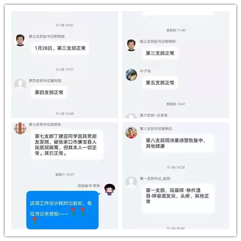 1、组织履责到位,确保防疫信息准确及时。疫情蔓延以来,crown皇冠体育平台党委、领导班子积极行动,先后成立了以书记、院长为组长、各系主任、支部书记为成员的工作组,严格履行人员摸排、每日信息报送的职责,利用crown皇冠体育平台教职工微信群、QQ群、crown皇冠体育平台领导班子群及时传达学校指挥部1-10号指令并认真落实。