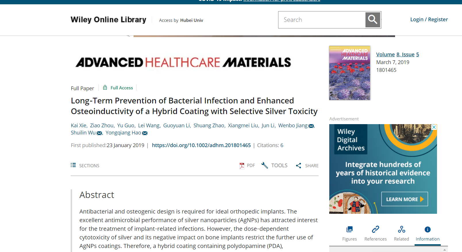 近日,crown皇冠体育平台crown皇冠体育平台吴水林教授课题组与上海交通大学第九人民附属医院合作,课题组成员2016级本科生周子傲(共同第一作者)在国际材料科学领域著名期刊《Advanced healthcare Materials》(影响因子6.24)上发表题为“Long-Term Prevention of Bacterial Infection and Enhanced Osteoinductivity of a Hybrid Coating with Selective Silver Toxicity”的研究性论文,并被Advanced healthcare Materials期刊作为热点文章以封面的形式刊出。